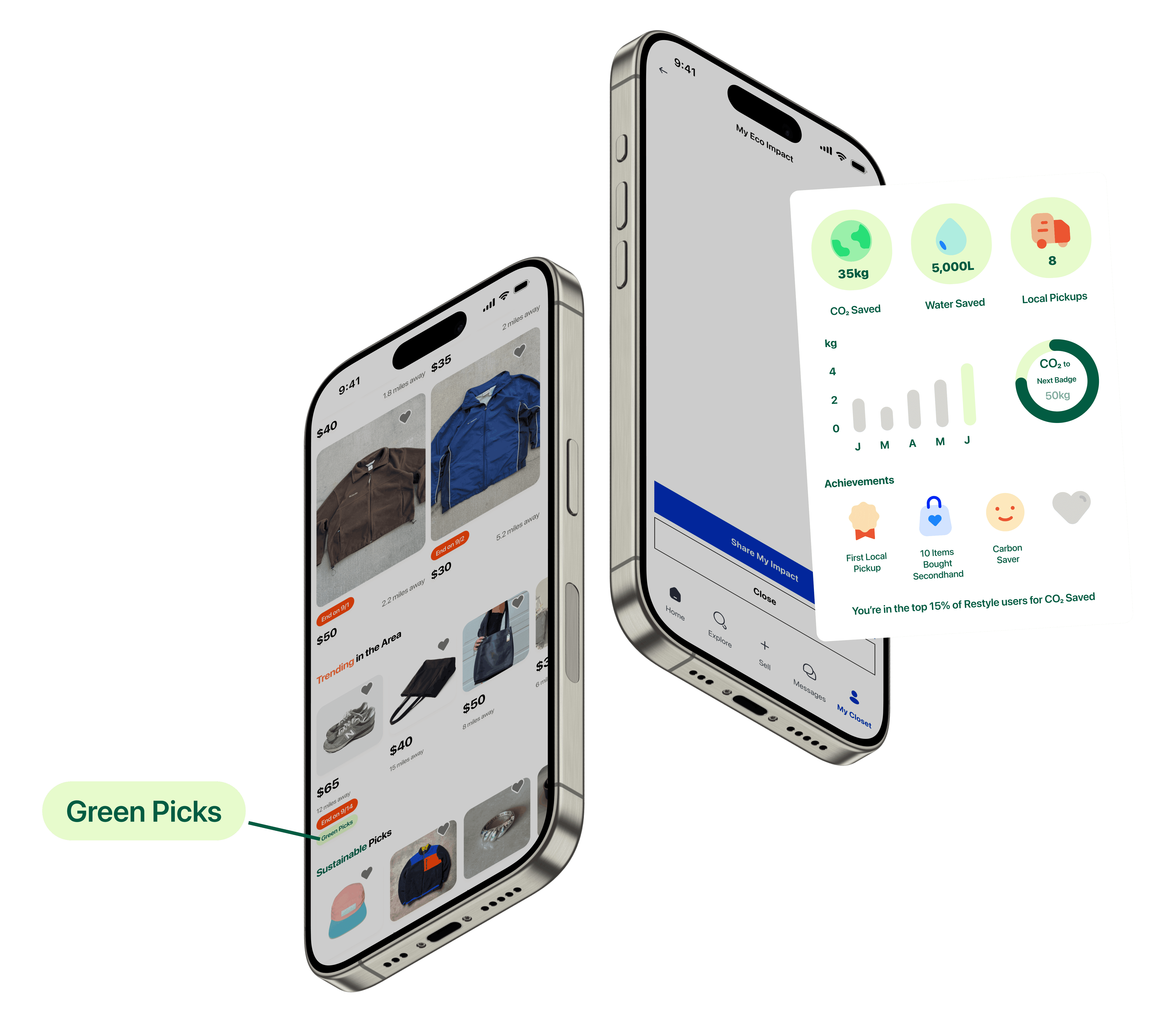 Sustainability indicators surface the environmental impact of local resale and reinforce eco-conscious behavior.