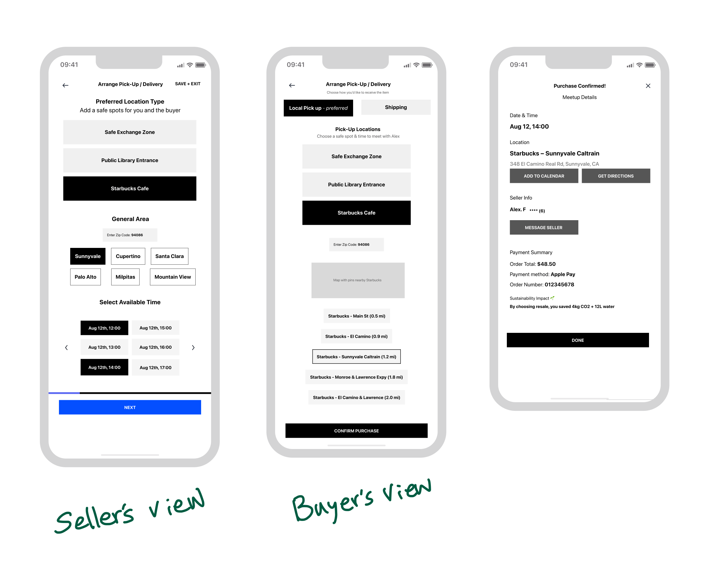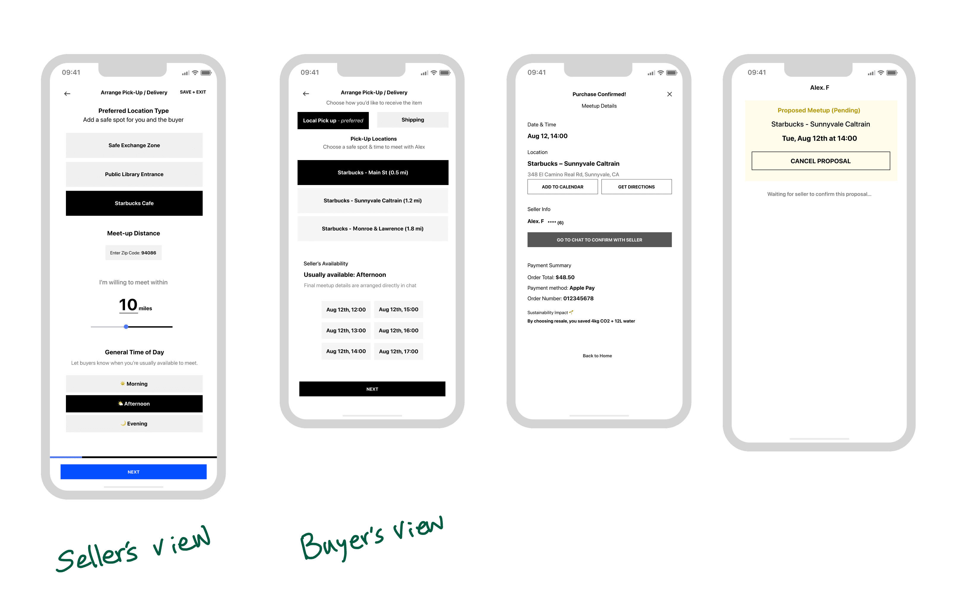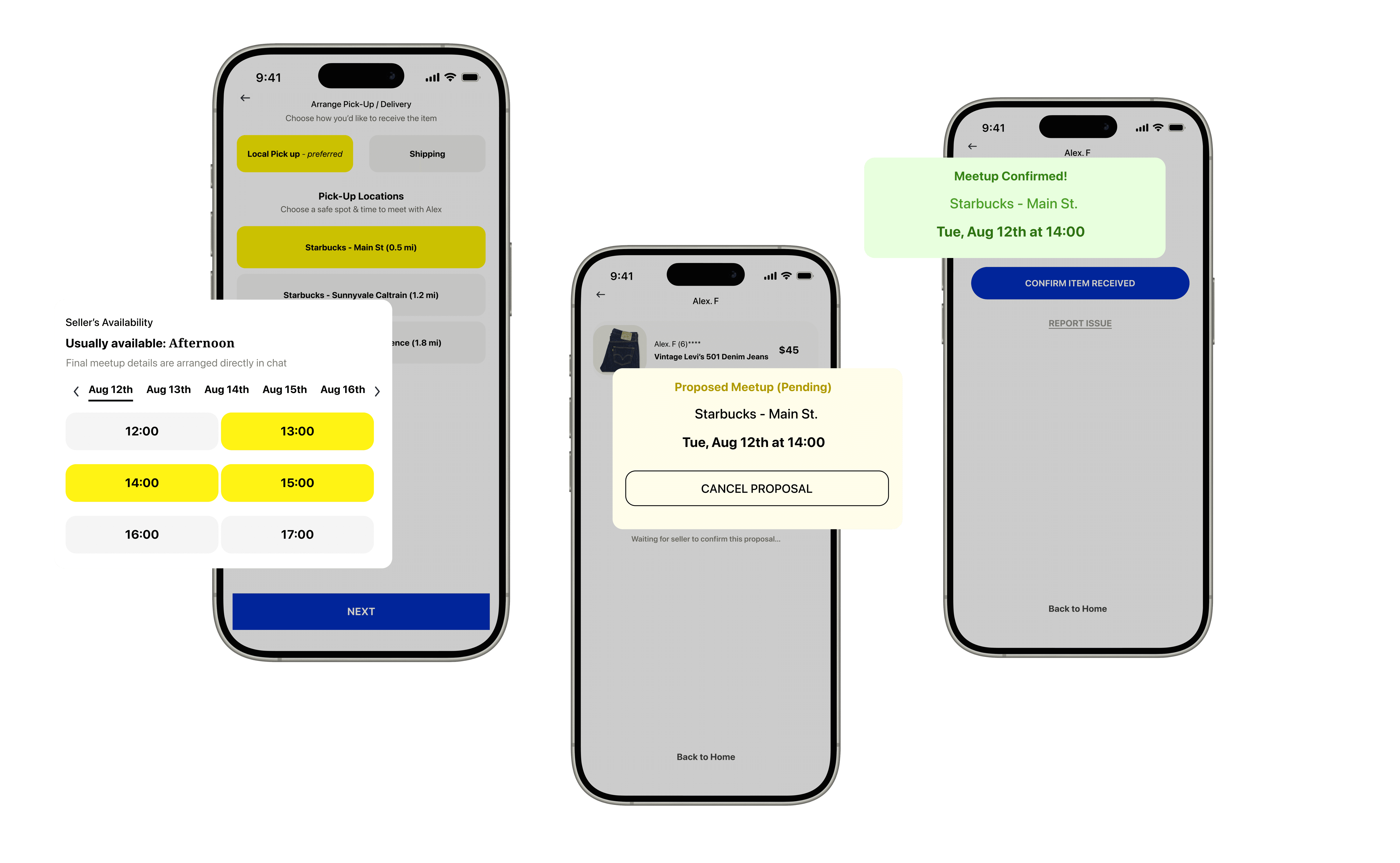 Sellers set a travel radius, and time availability is coordinated in chat, allowing buyers and sellers to align more naturally after the purchase.