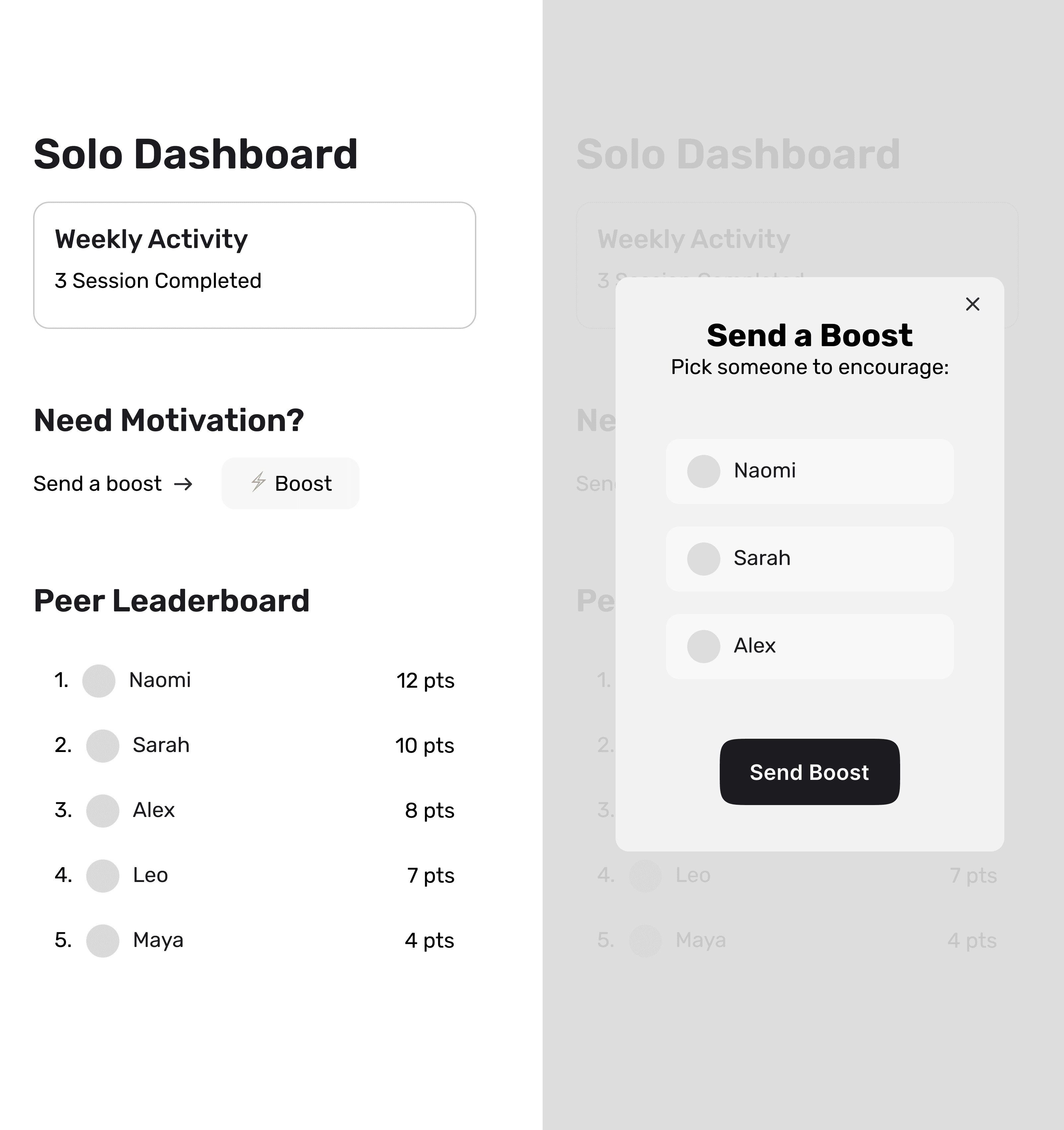 For users who prefer working out alone but still want motivation, this concept focuses on personal streak tracking, receiving boosts from friends, and a lightweight competitive leaderboard.