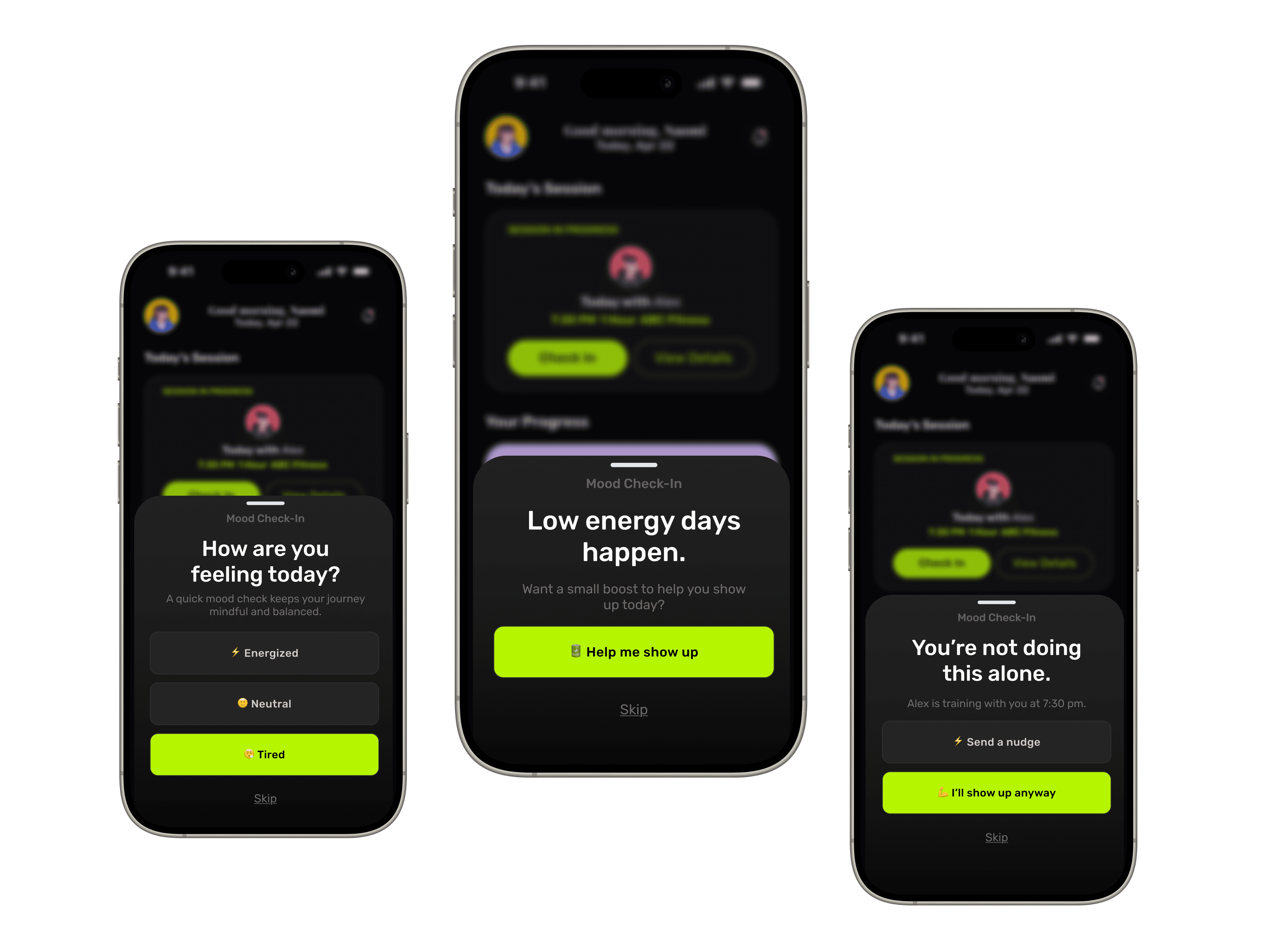 Motivation varies from day to day. Without clear communication, low-energy days often lead to silent cancellations or avoidance.