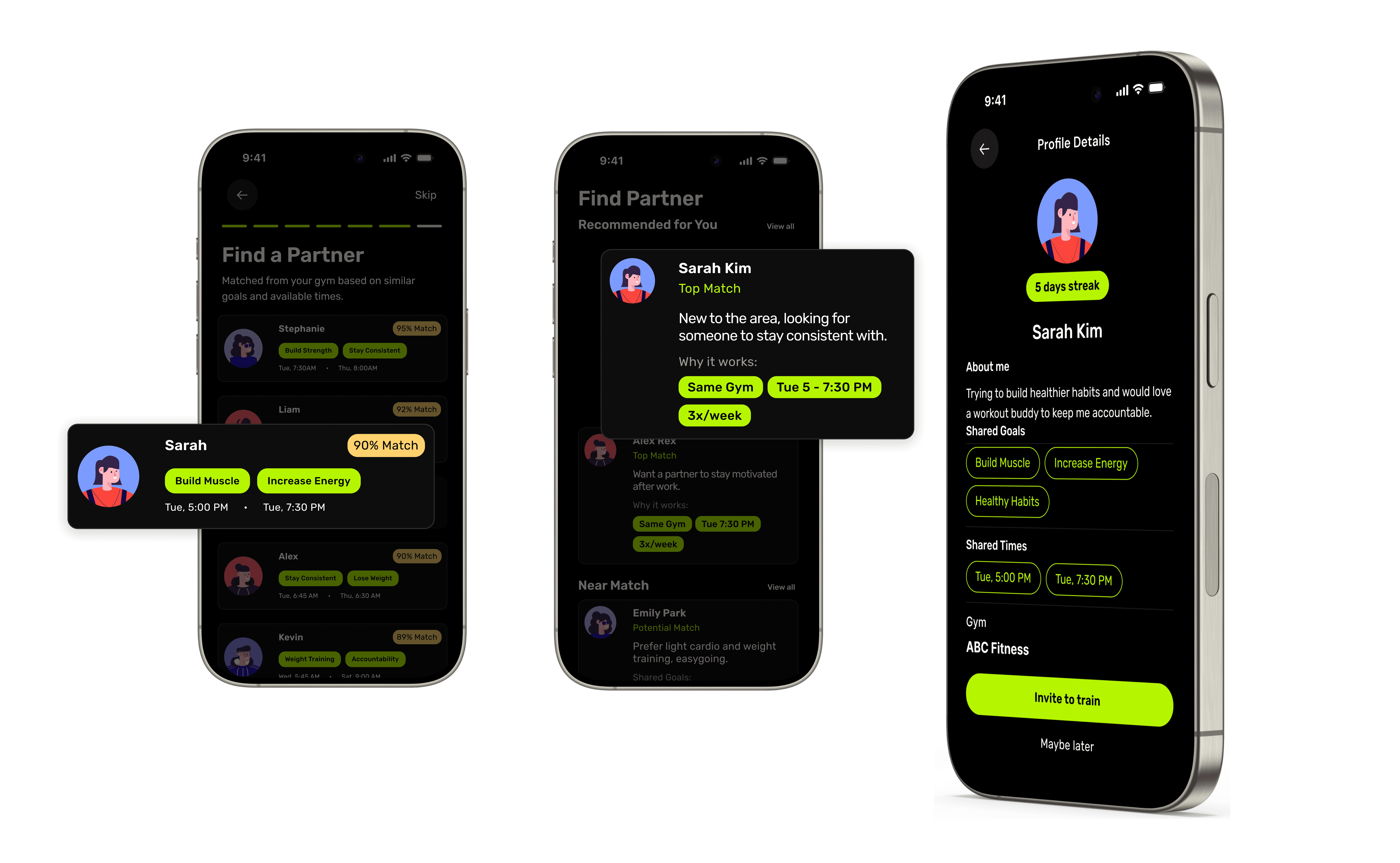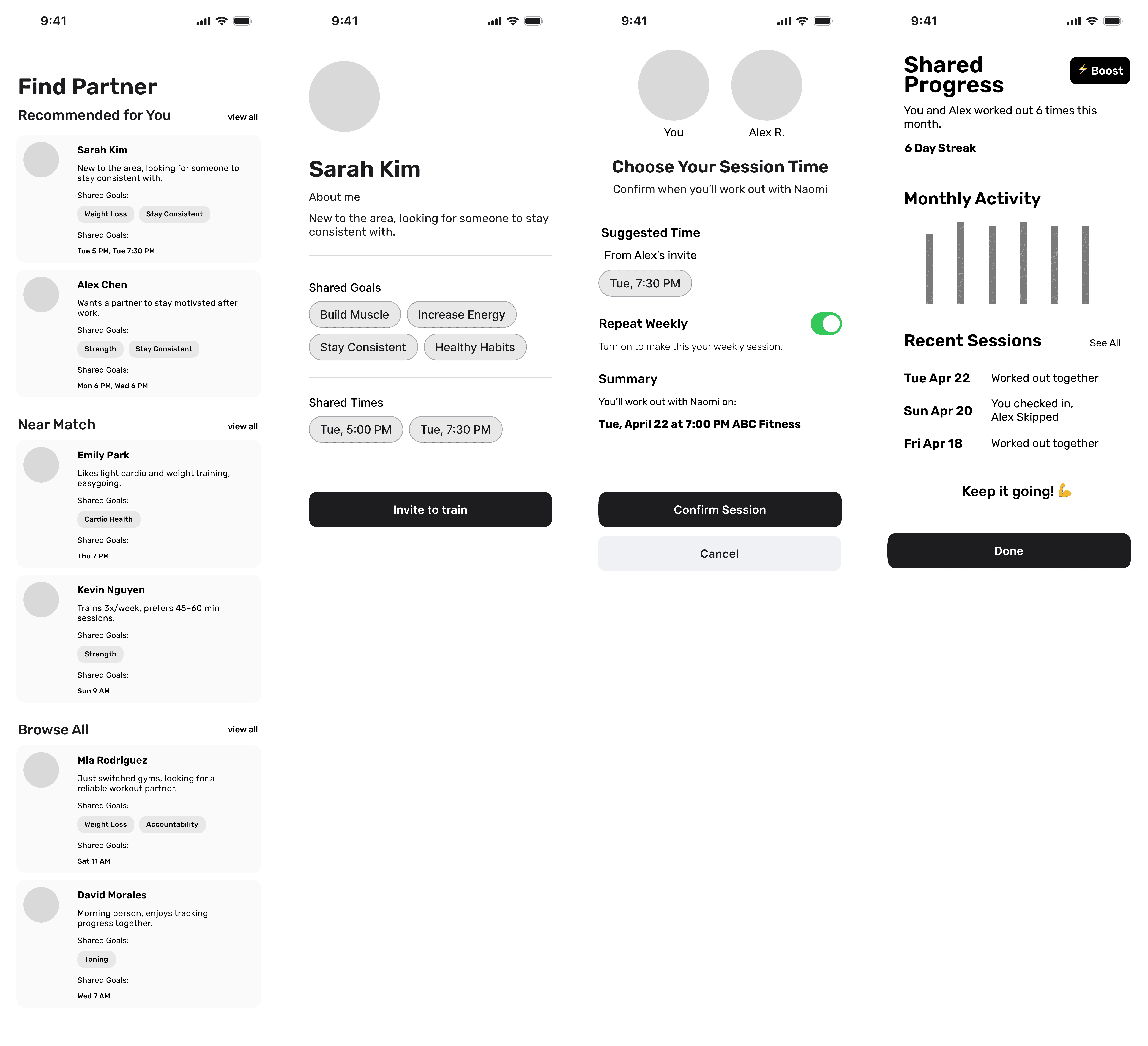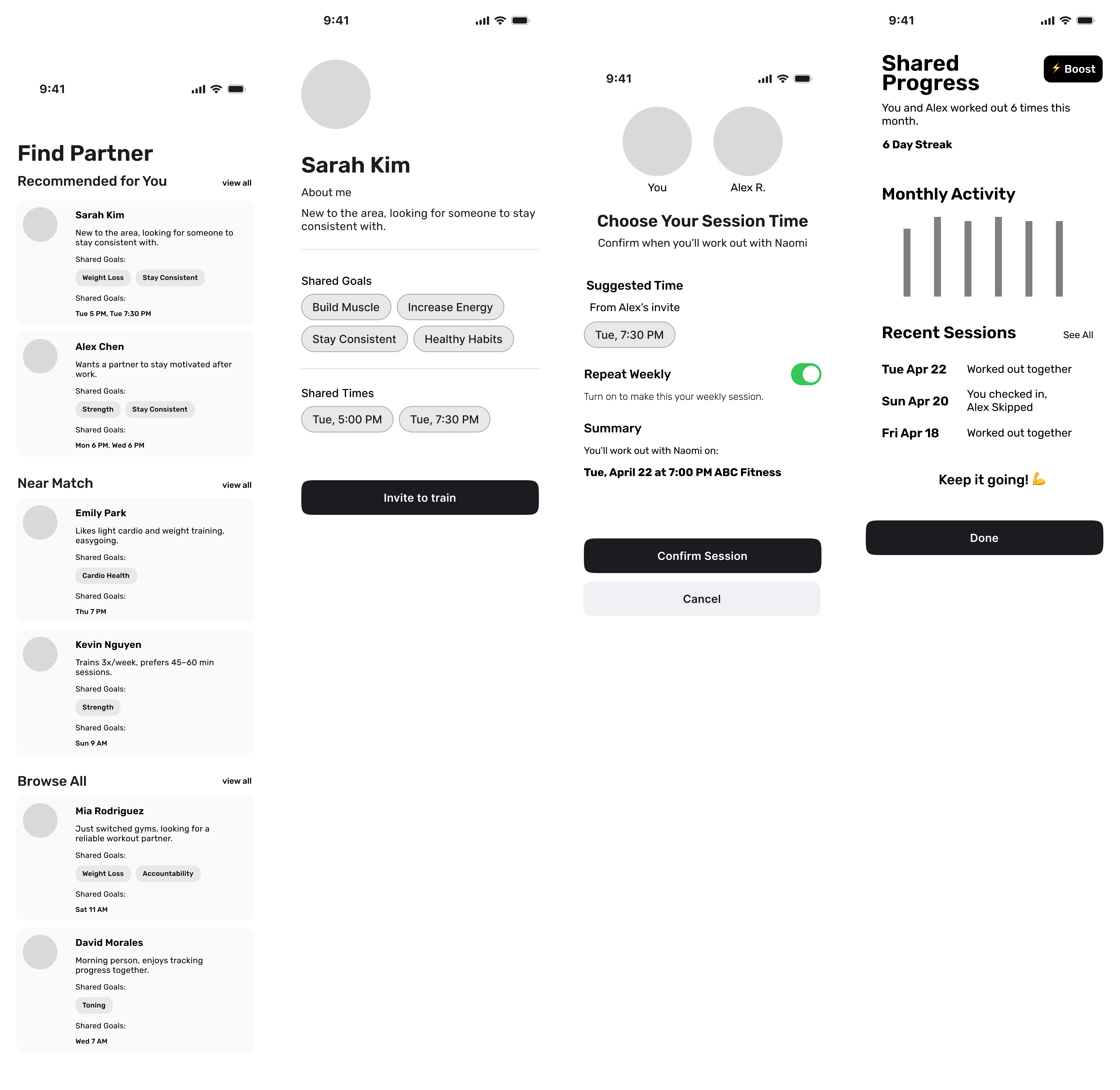 Pair users with workout partners who share similar goals, schedule, and gym — creating stronger accountability through a consistent buddy.