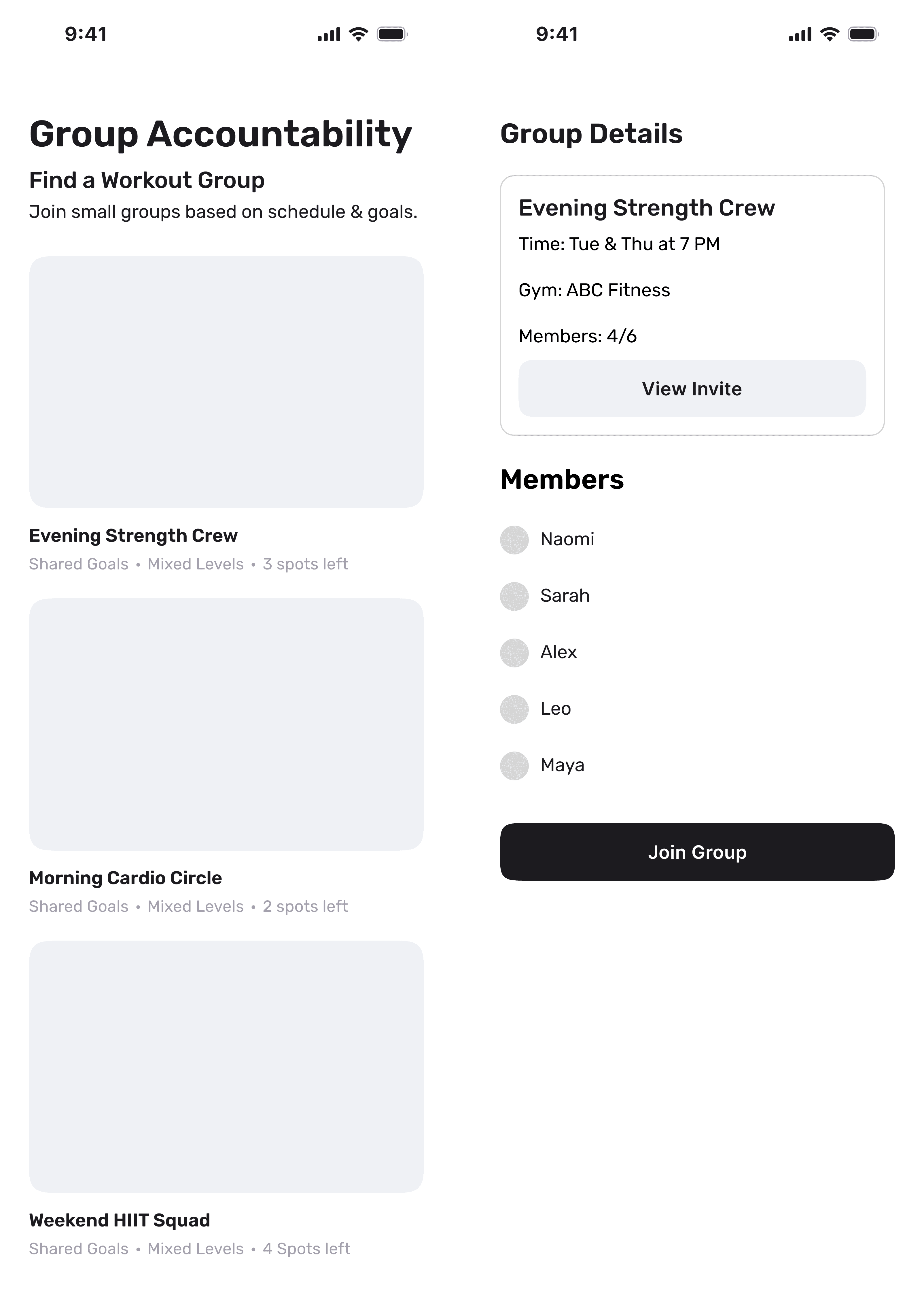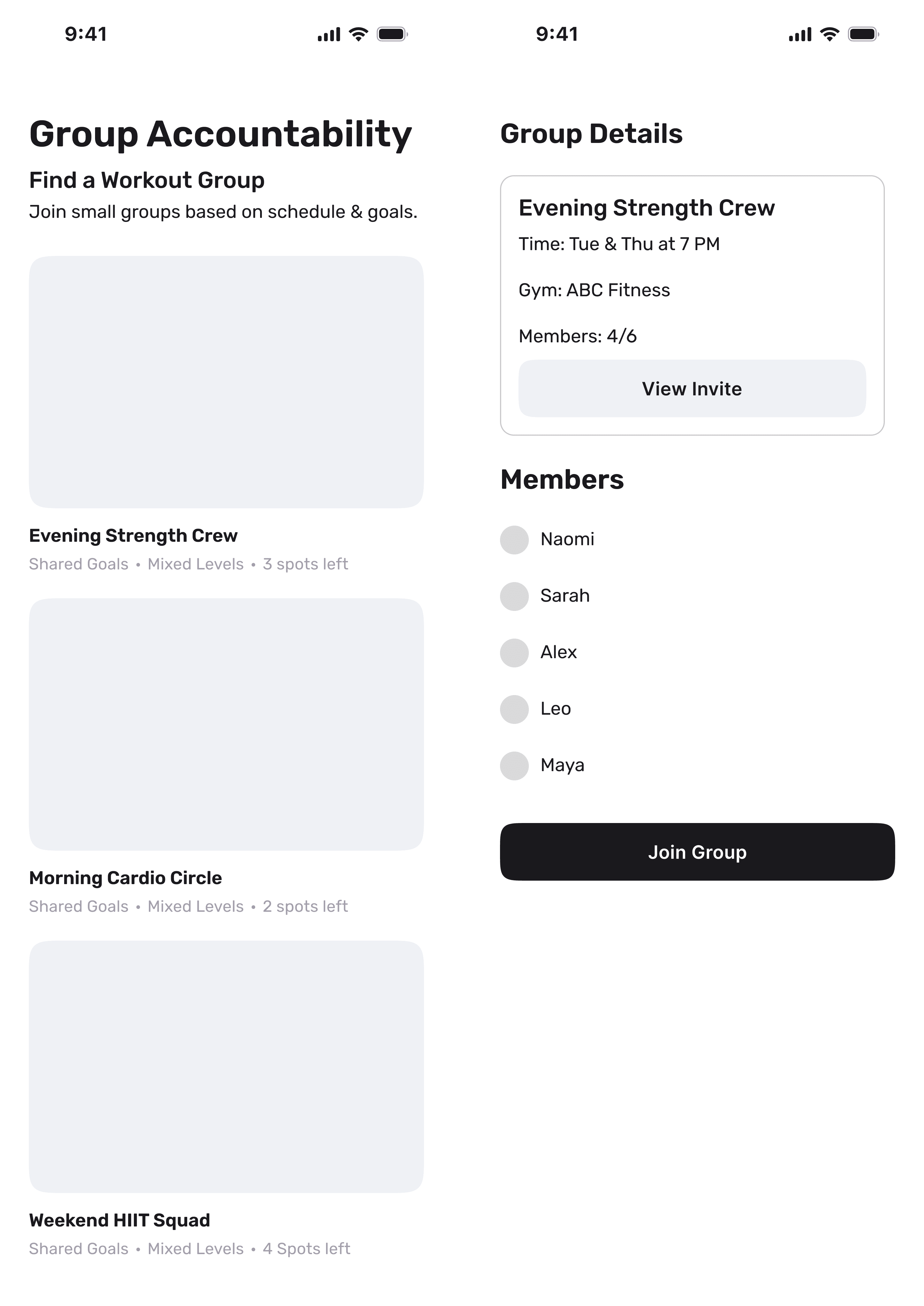 Users join small workout groups (3–6 people) that meet at similar times. This expands accountability beyond a single partner, reducing the risk of partner flakiness.